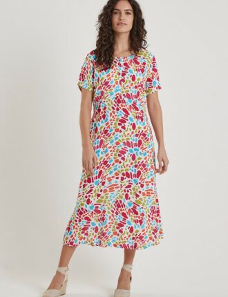 £69.00Exuding an air of elegance, the Roxy midi dress comes in this vibrant painterly print that will lift your mood whenever worn. Cut from Adini's popular viscose crepe for a weight free, drapey and cool finish, it comes in a tea dress style silhouette with a graceful swish and flattering fit. -